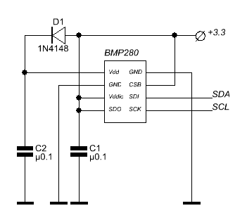 Доречі, у протоколі I2C повинні бути присутні підтягуючі резистори 4,7КОм на лініях SDA, SCL. На платі їх нема. Я використовую внутрішні резистори мікроконтролера. Їх номінал значно більший, але такий прийом працює з BMP085, BMP180 та BMP280. Зверніть увагу, що такий номер може не пройти з іншими мікроконтролерами.