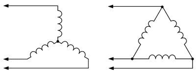 Трехфазные бесколлекторные двигатели приобрели наибольшее распространение. Но они могут быть и одно, двух, трех и более фазными. Чем больше фаз, тем более плавное вращение магнитного поля, но и сложнее система управления двигателем. 3-х фазная система наиболее оптимальна по соотношению эффективность/сложность, поэтому и получила столь широкое распространение. Далее будет рассматриваться только трехфазная схема, как наиболее распространенная. Фактически фазы - это обмотки двигателя. Поэтому если сказать "трехобмоточный", думаю, это тоже будет правильно. Три обмотки соединяются по схеме "звезда" или "треугольник". Трехфазный бесколлекторный двигатель имеет три провода - выводы обмоток, см. рисунок.