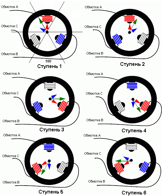 В трехфазной системе в каждый момент времени напряжение подается на две из трех обмоток. Таким образом, есть 6 вариантов подачи постоянного напряжения на обмотки двигателя, как показано на рисунке ниже.