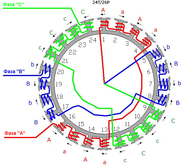 Обратите внимание, что обмотка имеет разные направления намотки на разных зубьях. Разные направления намотки обозначаются прописными и заглавными буквами. Детально о проектировании обмоток можно прочитать в литературе, предложенной в конце статьи.