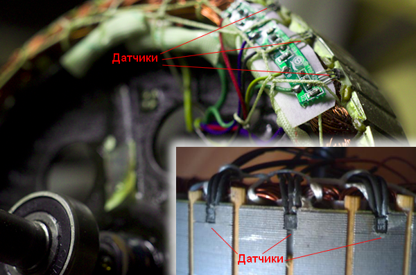 Иногда датчики располагают снаружи двигателя. Вот один из примеров расположения датчиков. На самом деле это был двигатель без датчиков. Таким простым способом его оснастили датчиками холла.