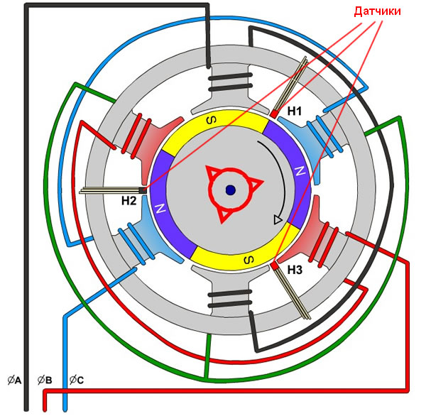 Устройство двигателей без датчиков отличается от двигателей с датчиками только отсутствием последних. Других принципиальных отличий нет. Наиболее распространены датчики положения, работающие на основе эффекта Холла. Датчики реагируют на магнитное поле, их располагают, как правило, на статоре таким образом, чтобы на них воздействовали магниты ротора. Угол между датчиками должен быть 120 градусов.Имеется в виду "электрических" градусов. Т.е. для многополюсного двигателя физическое расположение датчиков может быть таким: