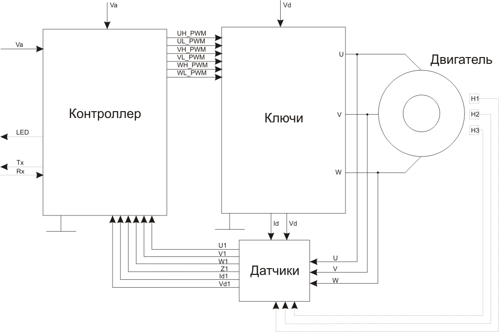 Условно разделим регулятор на следующие модули: Модуль контроллера - принимает задающие сигналы, сигналы датчиков, выдает управляющие сигналы на ключи Модуль силовых ключей - управляет силовыми ключами Модуль датчиков - совокупность различных датчиков и схем согласования.