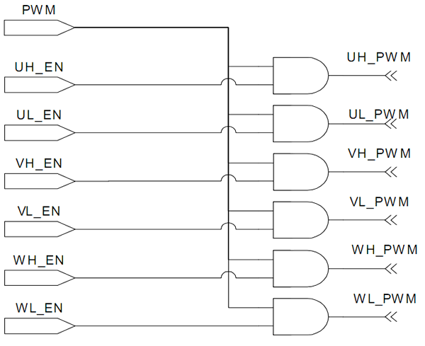 Регулятор должен гарантировать основные выходные сигналы:- ШИМ сигнал на 6 ключей (UH_PWM, UL_PWM, VH_PWM, VL_PWM, WH_PWM, WL_PWM).