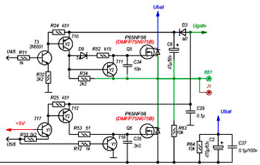 Так, в цьому випадку в якості драйверів виступають біполярні транзистори. Це також допустимо. Є також схеми, де в якості верхніх ключів використовуються транзистори з P-каналом, в якості нижніх - з N-каналом. Тобто, використовується два типи транзисторів, що не завжди зручно. До того ж P-канальні транзистори великої потужності майже неможливо знайти. Зазвичай використання таке поєднання транзисторів з різними каналами застосовують у малопотужних контролерах для спрощення схеми.