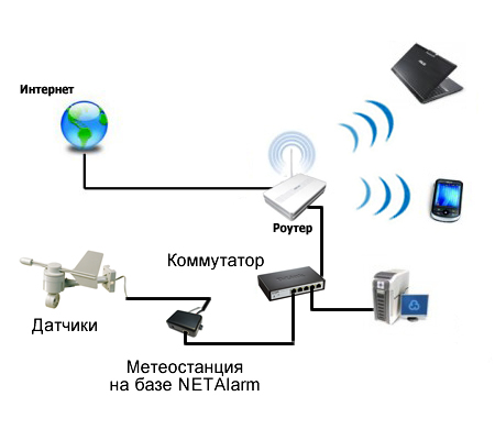 Раніше в мене працювала метеостанція, яку я зробив на базі NETAlarm (я про неї так і не написав). Її задача була досить простою: знімати дані з датчиків атмосферного тиску, вологості і температури і відправляти на сайт. Ця метеостанція досить довго і справно працювала. Та, коли постало питання щодо її подальшого розвитку, з`ясувалося, що у мікроконтролері вже не вистачає пам`яті. Ще одна, досить прикра, особливість - метеостанція повинна одночасно знаходитись у досяжності живлення(220В), комп’ютерної мережі і дротів від датчиків, які знаходяться знадвору. Для того, щоб дотягнути мережу, доводилось використовувати комутатора. До того ж, на час оновлення програмного забезпечення, доводилося її вимикати на тривалий час.