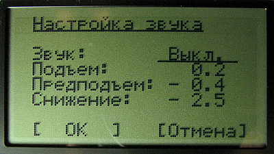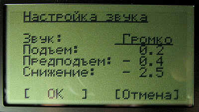 Пороги срабатывания звука для подъема, снижения, предподъема. При превышении показаний вариометра указанного порога включается соответствующий звук. Обратите внимание, что звуковая сигнализация предподъема включается при запущенном таймере полета. Это сделано для того, чтобы на старте прибор не "шумел". При необходимости сигнализацию предподъема можно отключить, установив порог срабатывания 0.