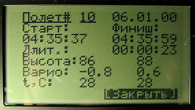 В памяти прибора сохраняются 10 крайних полетов. Время старта и окончания, длительность полета, максимальная/минимальная высота, максимальная/минимальная скороподъемность, максимальная/минимальная температура.