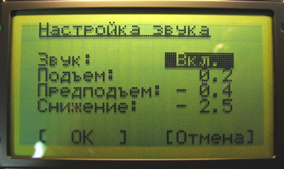 С помощью кнопок "Start/Up", "Reset/Down" выделяем значение интересующего нас поля. В данном случае поле "Звук:" имеет значение "Выкл." Для перевода его в режим изменения нажмите кнопку "Select".