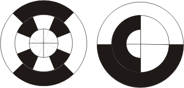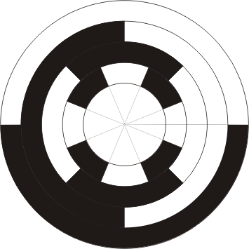 Ниже приведена модель 4 разрядного абсолютного энкодера с кодом Грея. 4 разряда - это 16 секторов - 360/16 = 22,5 градуса приемлемая точность для измерения направления ветра. Если возникают проблемы с габаритами, конструктивно диск можно разделить на части. В приведенном примере так и сделано.