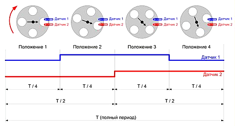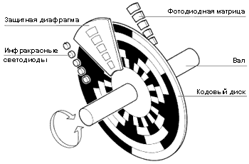 Датчик угла поворота, также называемый энкодер, предназначен для преобразования угла поворота поворотного механизма (вала) в электрические сигналы. Энкодеры могут быть контактными магнитными, оптическими и др. Мы рассмотрим самые распространенные - оптические. Устройство оптического датчик угла поворота (оборотов) состоит из светоизлучателей (чаще применяются инфракрасные светодиоды), фотоприемников (фототранзисторов), и проходящего между светоизлучателем и светоприемником кодового диска, который имеет прозрачные участки. Рисунок на кодовом диске энкодера называют растр. По количеству тактов (или времени между двумя тактами) определяется положение (скорость вращения).