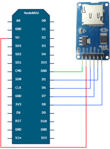 Якщо Вам потрібно зберігати великі об`єми даних і для цього не достатньо Flash пам`яті, до ESP8266 з NodeMCU можна підключити SD картку. NodeMCU працює з SD карткою так само як і з власною файловою системою, використовуючи модуль file. З одного боку це спрощує роботу з файлами, а з іншого це накладає такі самі обмеження на роботу з SD карткою як і з власною Flash. А саме: немає підтримки вкладених папок, немає мітки часу, не підтримуються атрибути файлів. Схема підключення: