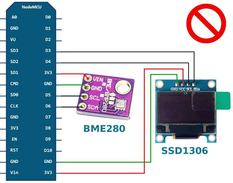 Зверніть увагу, що датчик bme280 і дисплей SSD1306 працюють по шині IIC, і ми підключаємо їх до різних GPIO виводів. NodeMCU дозволяє вказати на яких GPIO використовуються SDA, SCL лінії шини IIC. Але чи все так гаразд? Скільки окремих шин IIC ми можемо використати? NodeMCU дозволяє використовувати лише одну шину. І хоча функція i2c.setup має параметр id шини, він завжди має бути 0. Так сказано в документації до NodeMCU (https://nodemcu.readthedocs.io/en/master/en/modules/i2c/).