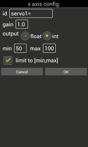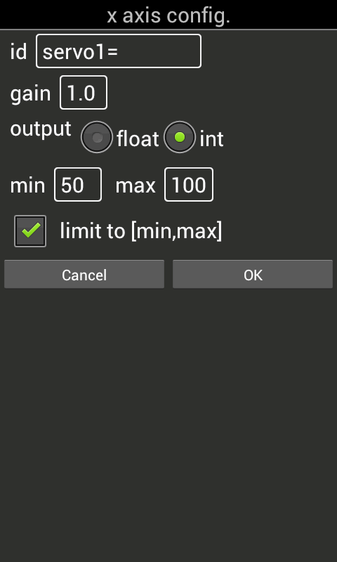 У налаштуваннях "x axis config" вказуємо ID "servo1=", та задаємо діапазон від 50 до 100: