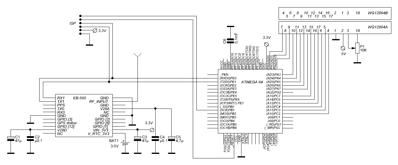 Некоторое время назад я публиковал статью GPS модуль EB-500 и ATMega и GPS. Расчет дистанции между двумя точками по GPS координатам. Расчет курса на точку. Теперь представляю пример схемы на базе контроллера ATMEGA64 проект для WinAVR (GCC). В проекте используется доработанная библиотека для EB-500 115200. Поскольку большинство модулей EB-500 теперь работают на скорости 115200, пришлось немного модифицировать разбор сообщений модуля.