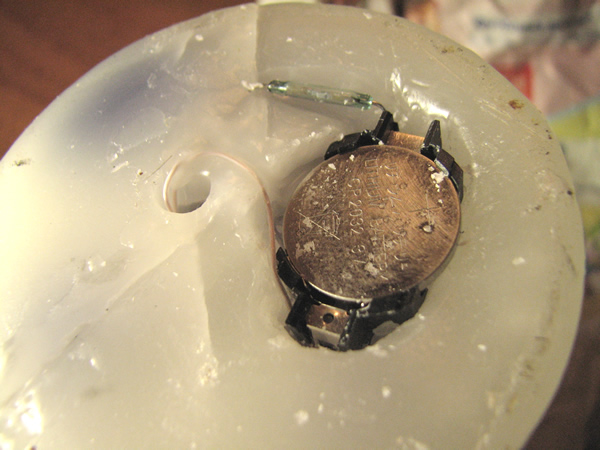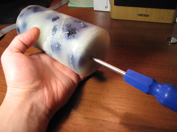 - Выковыриваем канал под светодиод снизу свечи примерно до середины свечи. Я делал это отверткой. Но лучше сверлом. При этом фитиль свечи должен оставаться целым. Функциональность свечи не нарушаем :). Если поспешить, свеча может расколоться. Поэтому делать это нужно аккуратно. Можно проплавить разогретым металлическим стержнем или трубкой;