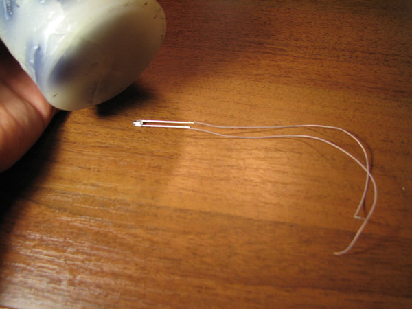 - Спаиваем светодиод батарейку и геркон последовательно. При этом соблюдаем полярность. Помещаем схему внутрь свечи;