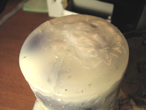 - Заплавляем все парафиновой стружкой. Для этого я использовал термофен. Выравниваем дно свечи, скрывая следы;