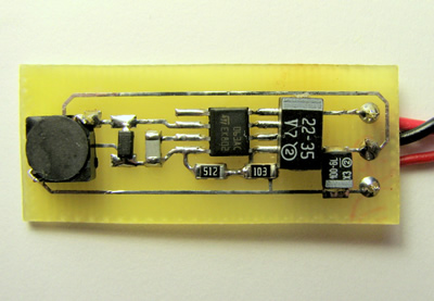 Схема взята из документации. У меня не было ограничивающего резистора 0,33 Ом (Rsc), я его убрал на свой страх и риск. Диод Шотки поставил тот который был. Номиналы входного и выходного конденсаторов также отличаются. Для первого тестового варианта сойдет, но лучше на этом не экономить. Получилась вот такая платка: