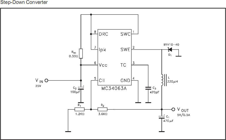 Существует масса специализированных микросхем, например LM2574, LM2594, LM267х, LT1073, L4971, ST1S03, AS1333, ST1S03, ST1S06, ST1S09, ST1S10, ST1S12 (ST1Sxx - очень достойная серия). Они существуют в разных корпусах для разных выходных напряжений и токов. Стоимость таких микросхем около 3 евро, однако мне требуется надежное и не дорогое решение. Микросхема MC34063 - это то, что нам сейчас надо. MC34063 очень распространена, купить можно без проблем. Стоимость всего от 0,2 евро! Работает с напряжением от 3 до 40 вольт, Максимальный ток 1.5А, частота преобразования 100KHz. Кстати, на ее базе можно собрать и повышающий преобразователь (см. так же "Повышающий DC-DC преобразователь на MAX1674" ), но сейчас мы займемся понижающим.