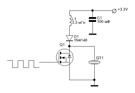 Існують різні схеми підвищення напруги, яка подається на п’єзо пищалку. Я перебрав декілька з них і зупинився на тій, з якою добився найкращих результатів:Ця схема видає однополярні імпульси, але вона досить проста і компактна. Найбільша деталь за розміром і ціною - це дросель. Працює схема наступним чином: коли відкривається транзистор, через дросель починає текти струм. Струм на дроселі не може вирости стрибком, на індуктивностях струм наростає поступово. Коли транзистор закривається, струм зменшується, а на виводі дроселя стрибком збільшується напруга. Рівень цієї напруги залежить від номіналу дроселя, вхідної напруги живлення, та інших параметрів схеми. В цій схемі задіяні такі елементи: