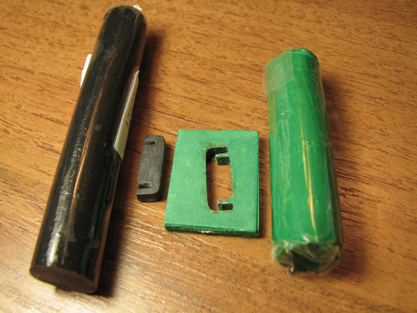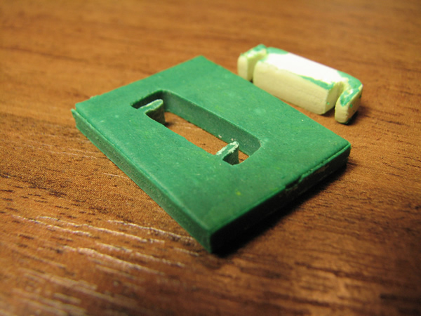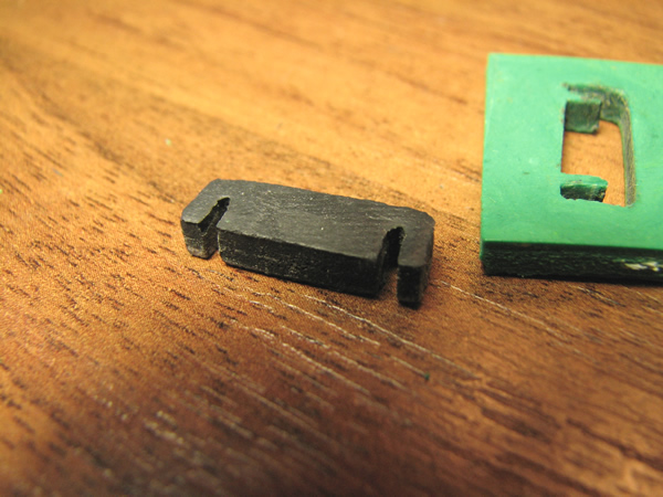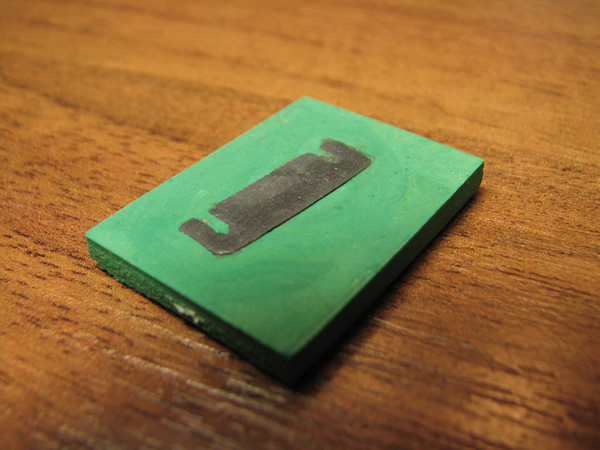 В качестве примера опишу процесс изготовления формы и детали. Сразу требуется сделать модель. Модель можно изготовить из любого материала. В нашем случае деталь мелкая, толщиной всего 3 мм. Прорези в детали 1мм и 0,8 мм. Модель закрепил на плоской поверхности, сделал опалубку из листового ПВХ. Залепил зеленой полимерной глиной, острым ножом срезал лишние остатки. Если не получилось с первого раза - не беда, выковыриваем и пробуем заново. После чего форму варил 15 минут в кипящей воде. Не все полимерные глины можно кипятить, некоторые требуют запекания в духовке при температуре 110-130 градусов. Разумеется, не следует использовать для этого посуду для пищи. Поскольку предполагается термообработка, материалы модели и опалубки должны выдерживать температуру до 130 градусов и не изменять свою форму. После извлечения модели и снятия опалубки получил вот такую форму: