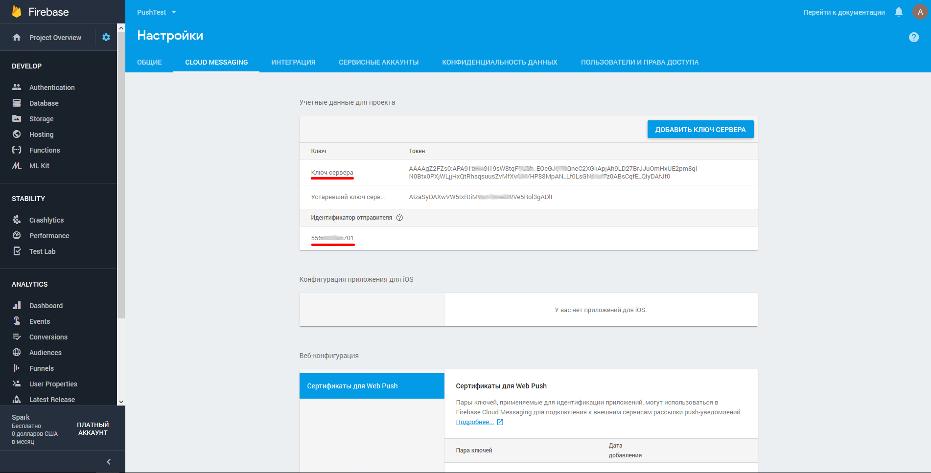 4. Копируем: Ключ сервера и Идентификатор отправителя