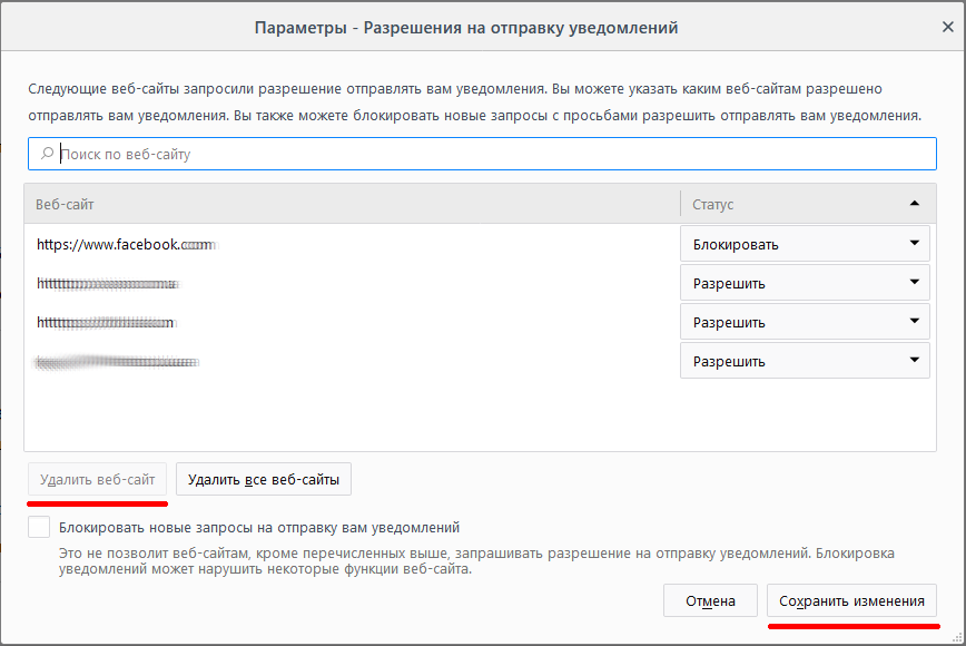 Находим нужный(не нужный) сайт и удаляем его из списка, сохраняем изменения. Теперь токен, который браузер отправил на сайт уже не действителен. Пытаемся снова отправить сообщение и получаем ответ типа: