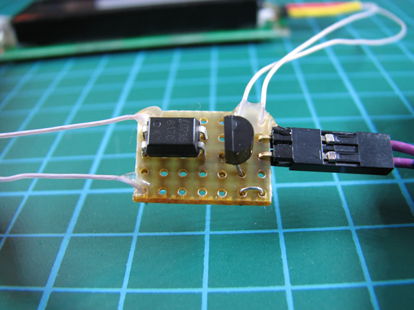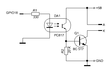 Ми вже з`ясували, що струм підсвічування може сягати значно більшого, ніж може витримати нога Raspberry Pi. Щоб керувати підсвічуванням, включимо його, як вказано на схемі.Оптопара захищає ноги Raspberry Pi від потрапляння на них напруги, яка подається на підсвічування. Вона вища за ту напругу, яку може витримати Raspberry Pi. Але сама оптопара не може комутувати потрібний нам струм, тому встановлено більш потужний транзистор. Звісно, транзистор має витримувати струм, який споживає підсвічування, з деяким запасом. У моєму випадку підсвічування споживало 420мА при напрузі 6,4В, а транзистор витримує 1 А.