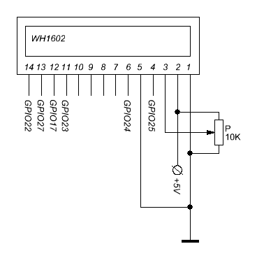 1 : GND 2 : 5V 3 : Contrast (0-5V) 4 : RS (Register Select) -> GPIO25 5 : R/W (Read Write) -> GND 6 : Enable or Strobe -> GPIO24 7 : Data Bit 0 - NOT USED 8 : Data Bit 1 - NOT USED 9 : Data Bit 2 - NOT USED 10: Data Bit 3 - NOT USED 11: Data Bit 4 -> GPIO23 12: Data Bit 5 -> GPIO17 13: Data Bit 6 -> GPIO27 14: Data Bit 7 -> GPIO22