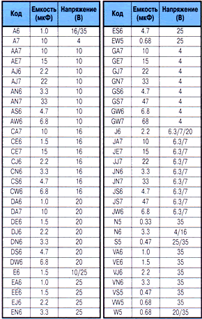 A. Код содержит два или три знака (буквы или цифры), обозначающие рабочее напряжение и номинальную емкость. Причем буквы обозначают напряжение и емкость, а цифра указывает множитель. В случае двухзначного обозначения не указывается код рабочего напряжения.