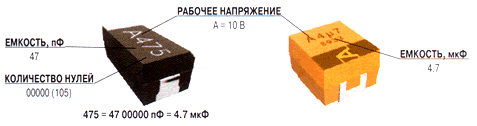 Ниже приведены примеры маркировки конденсаторов емкостью 4.7 мкФ и рабочим напряжением 10 В.