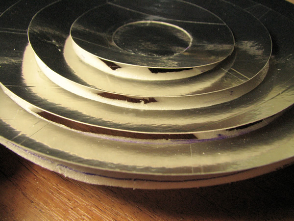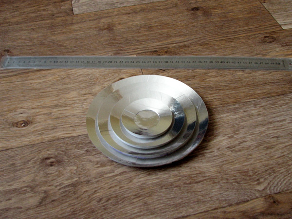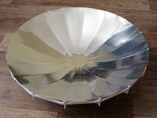 Для выяснения этого вопроса я сделал первый параболический тепловой концентратор из картона (фокус в чаше параболы). Выкройку из секторов оклеил обычной пищевой фольгой. Понятно, что качество поверхности, да и отражающие способности фольги, очень далеки от идеала.