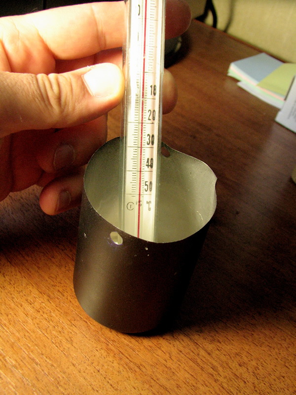 Это дало возможность спроецировать лучи на одну поверхность нагревателя и получать в фокусе большую температуру. Парабола без труда прожигает лист бумаги за несколько секунд. Эксперимент проводился около 7 часов утра в начале июня. По результатам эксперимента с тем же объемом воды и той же тарой получил мощность 28 Ватт., что соответствует примерно 102 Ватт/м.кв. Это меньше, чем в первом эксперименте. Это объясняется тем, что солнечные лучи от параболы ложилось на круглую поверхность банки не везде оптимально. Часть лучей проходили мимо, часть падали по касательной. Банка охлаждалась свежим утренним ветерком с одной стороны, в то время как подогревалась с другой. В первом эксперименте за счет того, что фокус был внутри чаши, банка прогревалась со всех сторон.