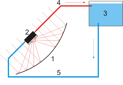 Емкость с водой помещается в фокус параболического солнечного концентратора. Солнечный концентратор ориентируется на Солнце.