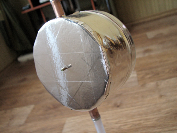 Нагрев происходит следующим образом: лучи от солнечного концентратора (1) через стекло проникают внутрь банки теплоприемника (2), где, попадая на черную поверхность, нагревают ее. Вода, соприкасаясь с поверхностью банки, поглощает тепло. Стекло плохо пропускает инфракрасное (тепловое) излучение, поэтому потери на излучение тепла минимизированы. Поскольку со временем стекло прогревается теплой водой, и начинает излучать тепло, было применено двойное остекление. Идеальный вариант, если между стеклами будет вакуум, но это труднодостижимая задача в домашних условиях. С обратной стороны банка теплоизолирована пенопластом, что также ограничивает излучение тепловой энергии в окружающую среду.