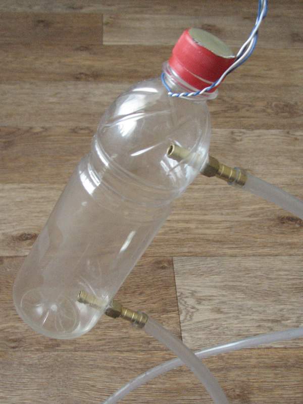 Теплоприемник (2) с помощью трубок (4,5) подключается к бачку (3) (в моем случае пластиковая бутылка). Дно бачка находится на 0.3м выше нагревателя. Такая конструкция обеспечивает конвекцию (самоциркуляцию) воды в системе.