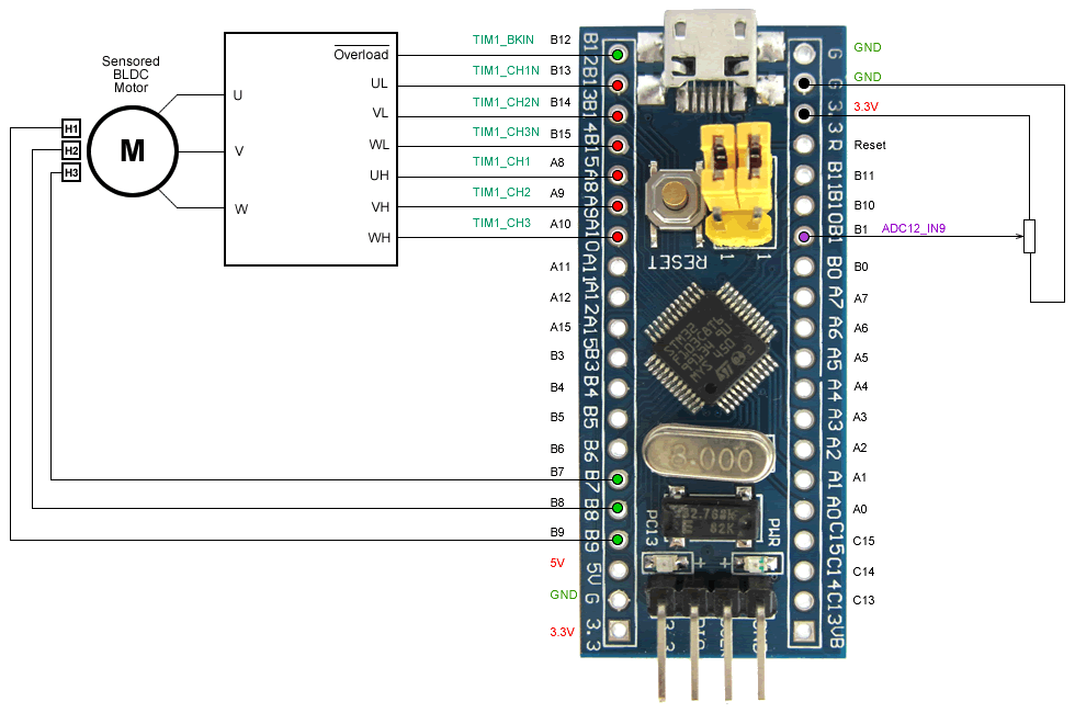Сигнали від трьох датчиків Холла (H1, H2, H3) подаються на входи мікроконтролера. Комутація ключів відбувається в залежності від стану сигналів з датчиків Холла. Коли відбувається зміна стану датчиків Холла, виникає переривання. Обробник переривання змінює стан вихідних сигналів. Шпаруватість PWM задається потенціометром. Для зчитування даних з потенціометра використовується один з вхідних каналів ADC з використанням DMA. Для відключення вихідних сигналів у разі перевантаження по струму використовується вхід таймеру TIM1_BKIN. Передбачається що на вхід TIM1_BKIN буде подаватись дискретний сигнал з компаратора підключеного до датчика струму. Як бачите для аварійного відключення вихідних сигналів також використовуються ресурси першого таймеру. До того ж відключення відбувається на апаратному рівні. Це виключає виникнення навіть найменших затримок які можуть бути у випадках коли для цього використовується програмне рішення, наприклад використовуються переривання.Програмне забезпечення