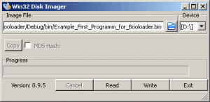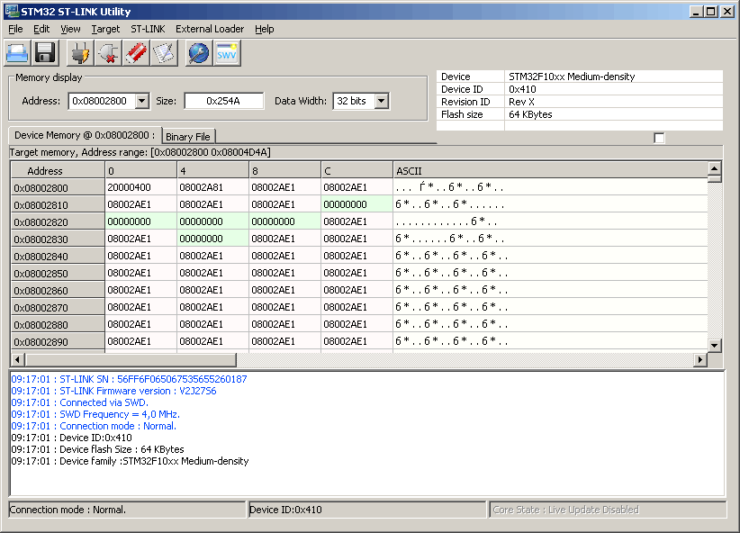 Отже, оскільки операційна система бачить наш пристрій як диск, просто задампимо (стандартним ПЗ) на нього наш bin - файл. Він ляже у флеш в акурат з потрібної нам адреси (у нашому випадку 0x08002800). Тобто, люба утиліта, яка може заливати образ диску на флешку зможе залити нашу прошивку. Ми просто підсунемо програмі замість образу диска нашу прошивку у форматі bin. Так, система не побачить на ньому файлову систему, але нам цього і не треба? Головна задача буде вирішена - прошивку буде оновлено. Чому саме bin - файл а не, скажімо HEX? Саме bin - файл - бінарний файл, який фактично є дампом пам`яті для мікроконтролера. Дамп залити можна стандартною командою dd (під Ubuntu). Під Windows можна використати дуже популярну програму Win32DiskImager для запису образів дисків на Flash-носії. Для перевірки цього метода можна переглянути як саме виглядає програма у флеш пам`яті мікроконтролера за допомогою програматора і ST-LINK Utility. Залийте bin - файл звичайним програматором і описаним мною методом і порівняйте. Результат буде ідентичним!