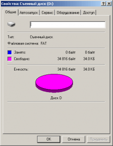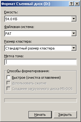 Запрограмуємо мікроконтролер і підключимо його USB шнуром до комп`ютера. Комп’ютер має побачити прилад і використати для спілкування з ним стандартні драйвери. При цьому Windows змонтує його як диск, при переході на нього, Windows скаже що диск не відформатований. Це нормально. Форматуйте його. Тепер на нього можна писати файли. Правда, невеличкі. Давайте подивимось який об’єм нам доступний. 54Кб? Ні, менше! А чому? Тому що на "диску" має розташовуватися таблиця FAT. Тобто, ми ніяк не зможемо записати на нього файл 54Кб.