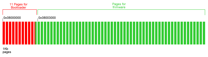 Оскільки ми не можемо перепрошити первинний Bootloader мікроконтролерів STM, наш Bootloader буде знаходитись у пам`яті програм. Фактично Bootloader - це Ваша програма яка буде опікуватися процесом прошивки. Тобто, при включенні мікроконтролера буде запускатися саме Bootloader, як звичайна програма. Звісно, с самого початку Bootloader має з’ясувати що йому робити. Заливати нову програму чи передати управління вже залитій програмі. Це може бути перевірка наявності прошивки на носієві, або перевірка стану якоїсь кнопки чи перемички. Другий метод мені подобається дужче бо так можна уникнути непотрібних затримок при старті. Натиснута кнопка при включенні приладу - ідемо оновлятися. Не натиснута - працюємо як завжди. Питання звідки Bootloader буде забирати прошивку і починаючи з якої адреси записувати у Flash мікроконтролера, це цілком ваші питання, як розробника. І ми розглянемо ці питання на прикладі. В залежності від реалізації конкретного приладу і наявності у нього певної периферії, прошивку можна передавати у мікроконтролер через інтерфейс UART, IIC, SPI, USB, тощо. Звісно, Bootloader буде займати певну частину пам`яті і для основної програми залишиться решта пам`яті. Ви маєте чітко знати скільки займає Ваш Bootloader і починаючи з якої адреси у Flash буде знаходитися Ваша основна програма. Стандартно, для STM32F103, програми знаходяться починаючи з адреси 0x08000000. Саме починаючи з цієї адреси буде розташований Bootloader. Якщо наш Bootloader буде займати 10Кb. Тоді головну прошивку треба розташувати починаючи з адреси 0x08002800. Тобто, з відступом у 10Кb. При цьому відступ має бути кратний розміру сторінки Flash. Згадаємо як організована Flash пам`ять мікроконтролера. Треба чітко пам`ятати, що Flash поділена на сторінки. У нашому контролері (STM32F103) розмір сторінки 1Kб. Адреса, починаючи з якої буде розташована основна прошивка, має вказувати на початок не зайнятої Bootloader-ом сторінки. Наприклад, якщо Bootloader буде розміром 10300 байт. Він займе цілком перші 10 сторінок (10240 байт) і 60 байт одинадцятої сторінки. Ми маємо розташувати основну прошивку починаючи з 12-тої сторінки (адреса: 0x08003000). Чому ми не можемо зайняти частину 11-ої сторінки? Вона ж майже вся вільна! Перед записом у флеш треба спочатку стирати сторінку. При цьому стирається сторінка цілком. Не має можливості стерти частину сторінки. Про це йшлося у статті STM32. Програмування STM32F103. Flash. Якщо ми вкажемо адресу, де має починатися основна прошивка з середини 11-ої сторінки, тоді при оновленні прошивки Bootloader-у потрібно буде перед записом спочатку стерти сторінку 11. Це саме сторінка де знаходиться його останні байти. Він зітре сторінку цілком. Таким чином він може "стрильнути собі у ногу". Тому основна прошивка має займати сторінки пам`яті які не зайняти Bootloader-ом.
