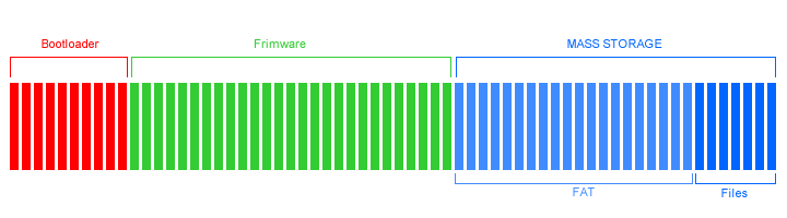 Мене приваблює Bootloader у режимі USB Mass Storage. При підключенні до USB комп’ютера, мікроконтролер має бути для операційної системи як USB Mass Storage Device. Тобто, як невеличка флешка у декілька кілобайт. Для оновлення прошивки достатньо записати на неї новий файл. Це, на мою думку, самий прийнятний метод оновлення прошивки для кінцевого користувача. По перше він не потребує спеціалізованого програмного забезпечення, по друге має працювати на любій операційній системі де існує поняття файлової системи. Це був би ідеальний варіант. Але це у теорії все красиво, на практиці все трохи складніше. Спочатку я знайшов таку реалізацію: http://blog.myelectronics.com.ua/stm32-usb-mass-storage-bootloader/ Але для нашого мікроконтролера таке рішення не прийнятне. У цьому рішенні Flash пам`ять мікроконтролера поділена на декілька частин. А саме на частини де лежить Bootloader, де знаходиться основна прошивка, та область пам`яті відведена під MASS STORAGE. Прошивка спочатку записується на MASS STORAGE диск. А потім копіюється у потрібну область. Тобто прошивка має бути менше ніж половина пам`яті мікроконтролера. Це дуже мало, коли у нас усього 64Кб.