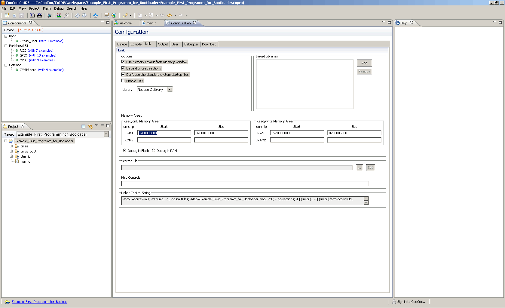 Оскільки наша основна програма тепер буде знаходитись у пам`яті починаючи з адреси 0x08002800, а не 0x08000000, це треба вказати у властивостях проекту у налаштування Linker-а.