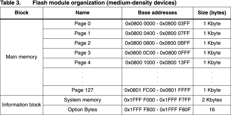 Ця таблиця наведена для усіх STM32F103 medium-density devices. Наш контролер (STM32F103C8) має 64 Кб Flash пам`яті. Тобто, адреса початку останньої сторінки 0x800FC00.