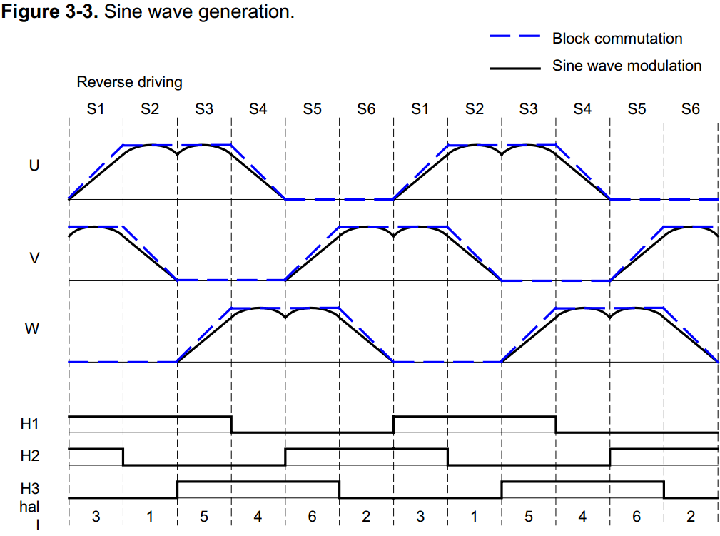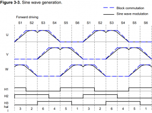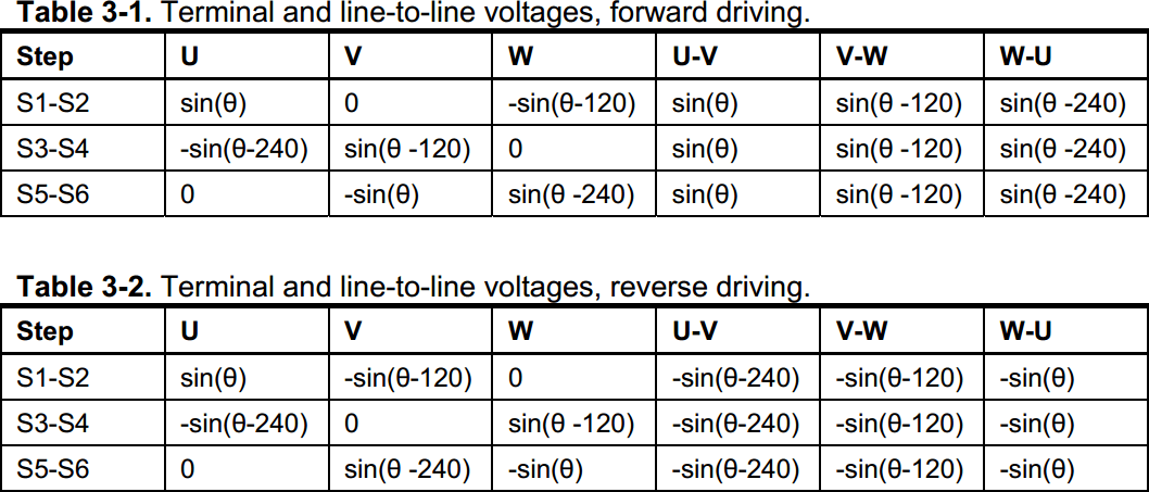 Генерувати синусоїди для кожної фази - це прямий метод, але є більш ефективний спосіб. Ми будемо генерувати три синусоїдальних напруги фаза-фаза (диференціальне напруга між двома фазами) із зсувом фази на 120 градусів між ними. Таблиці 3-1, 3-2 показують, як цього можна досягти, не роблячи повні синусоїди для кожного виводу двигуна.