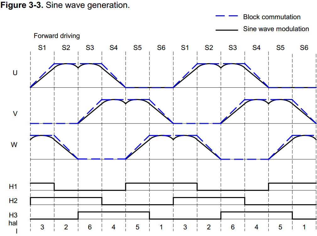 У момент старту двигуна швидкість ротора невідома, поки не відбудеться послідовно дві зміни стану датчиків Холла. Щоб забезпечити нормальний запуск двигуна, поки швидкість обертання ротора не відома, застосовується блочна комутація. Тобто, контролер керує двигуном як (BLDC). Цей метод був описаний раніше. Приклад для STM32 знайдете тут. Карта напруг, яка використовується в режимі блочної комутації, показана на малюнку (штрихова синя лінія) на тлі з синусоїдальною напругою. Як тільки швидкість обертання ротора буде визначена, відбувається перехід до синусоїдального збудження.