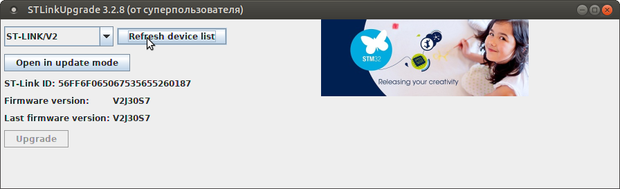 (Якщо java не встановлена - матюкнется і підкаже пакет який потрібно встановити). Запускаємо STLinkUpgrade.jar і оновляємо прошивку програматору (програматор треба встромити у USB компа :) ).
