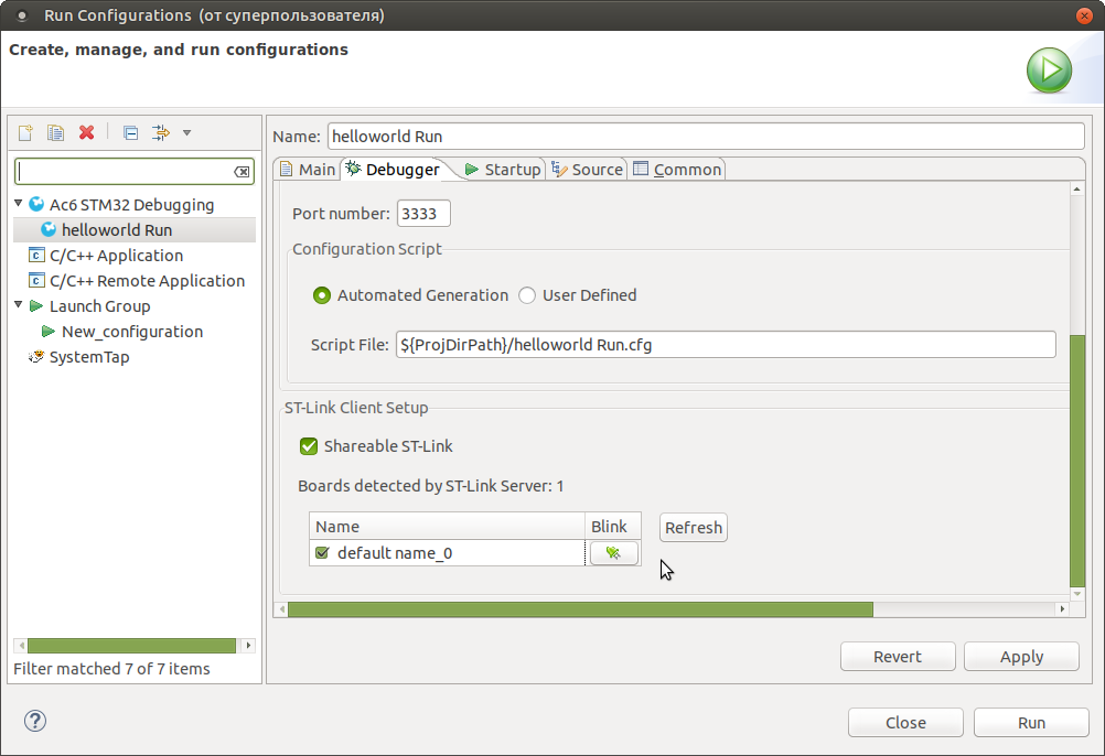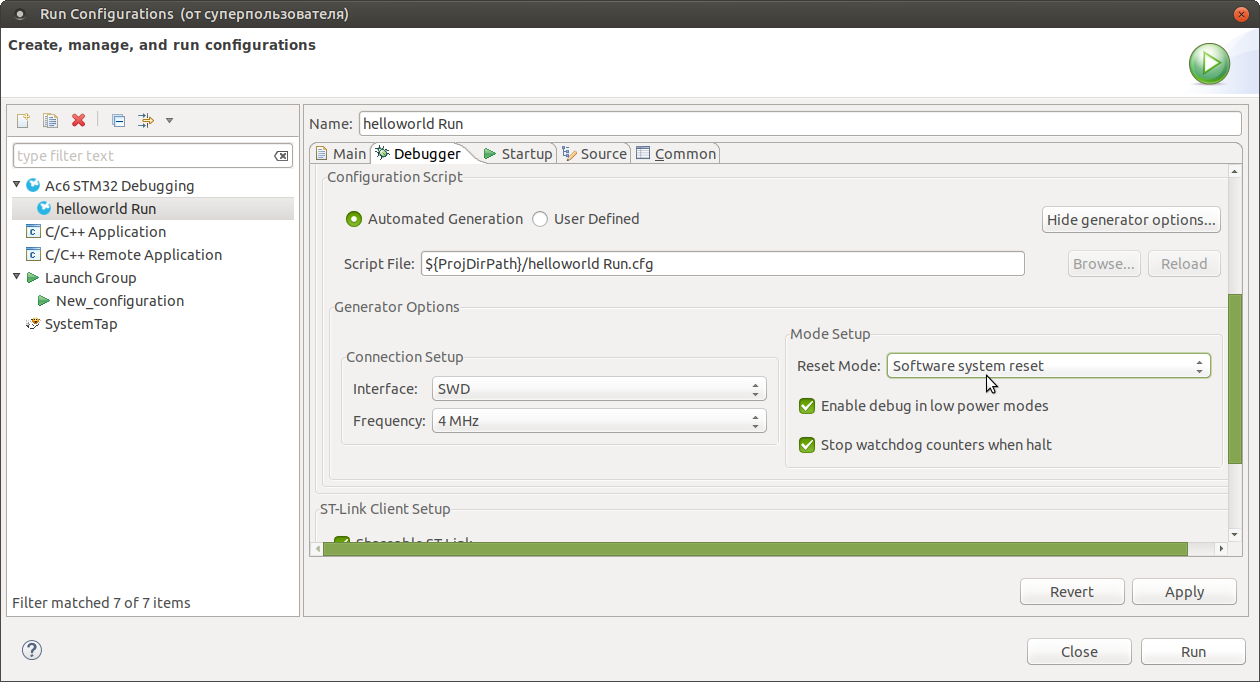 7. Якщо у налаштуваннях Run закладка Debugger пише що ST-Link сервер не встановлений, встановлюємо його. Він лежить тут: ~/Ac6/SystemWorkbench/stlinkserver/st-stlink-server-1.0.12-1-linux-amd64.deb8. Після встановлення st-stlink-server-1.0.12-1-linux-amd64.deb в налаштуваннях Run намагаємось увімкнути програматор. У мене вилізло повідомлення "Оновити прошивку". Мається на увазі прошивку у програматорі ST-LINK v2.