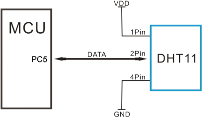 Не так давно, наткнулся на цифровой датчик влажности и температуры DHT11 (описание DHT11.pdf, DHT11_a.pdf). Когда то купил, да так и никуда и не пристроил. Решил проверить работу этого датчика. Подключил его к тестовой плате, подключил символьный дисплей. Передача данных выполняется по единственному проводу. Датчик имеет 4 вывода, но задействовано только 3. Схема подключения датчика: